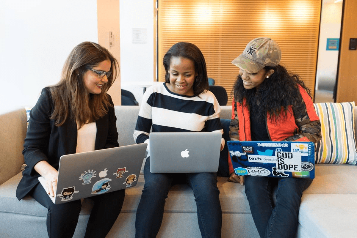 • three men sitting while using laptops and watching man beside whiteboard